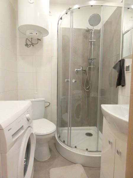 Łazienka z WC: kabina prysznicowa, umywalka, pralka, bojler elektryczny.