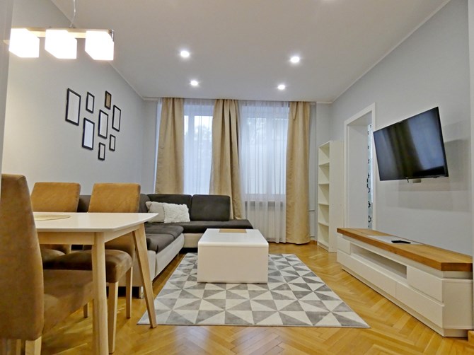 Składa się z przestronnego salonu, sypialni, pokoju, oddzielnej kuchni oraz łazienki z wanną.