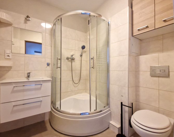 Łazienka (razem z WC): kabina prysznicowa, umywalka, lustro, szafki.