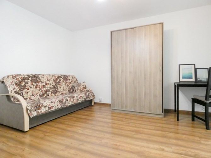 Pokój: 2 rozkładane kanapy, 2 biurka z krzesłami, 2 szafy.