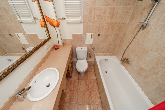 *Łazienka: wanna, masywny blat, dużym lustrem oraz WC.