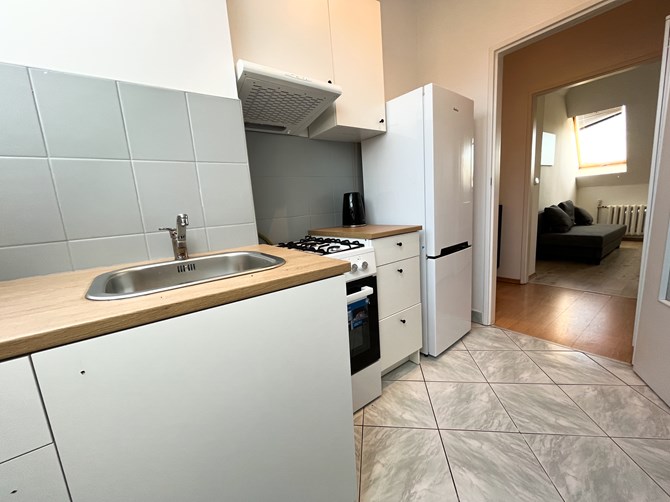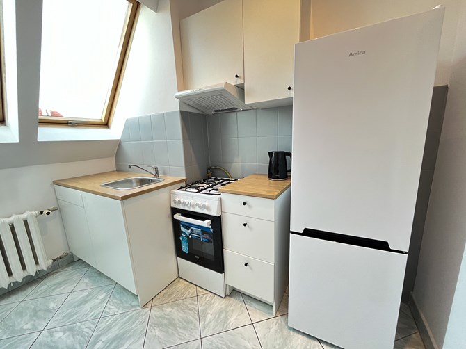 Kuchnia wyposażona w szafki kuchenne, lodówkę, kuchenkę oraz pochłaniacz.