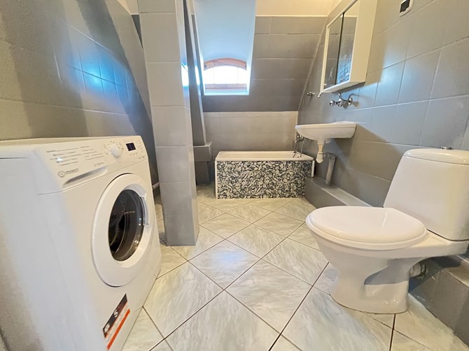 Łazienka z wanną, umywalką, sedesem oraz pralką.