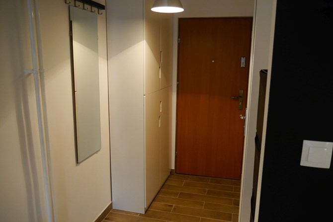 Przedpokój: szafka na buty, wieszak, lustro oraz duża szafa.