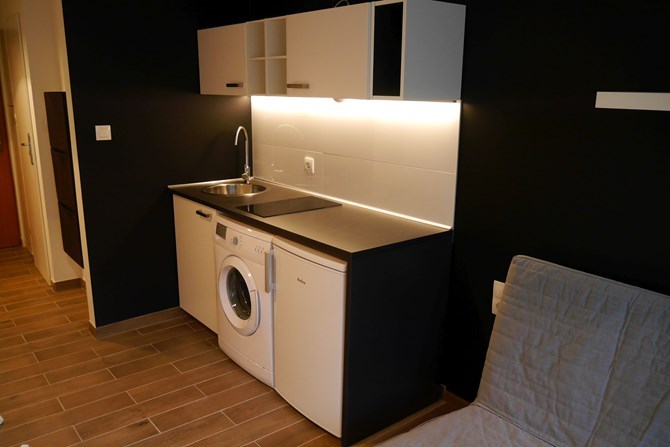 Składa się z pokoju z aneksem kuchennym i łazienki.
