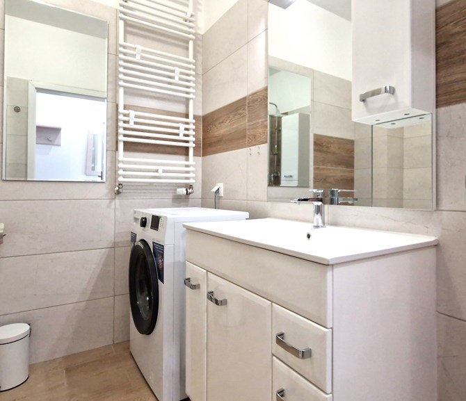 Łazienka razem z WC: kabina prysznicowa, umywalka, szafki, pralka, lustro.