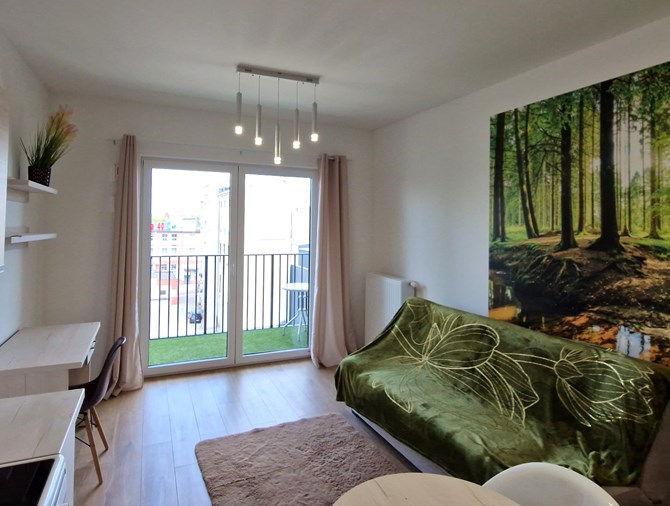 Do wynajęcia jasna i w pełni wyposażona kawalerka w apartamentowcu przy ul. Pomorskiej 45A w Łodzi, idealna dla jednej osoby lub pary, w ścisłym centrum miasta, z szybkim dostępem do Manufaktury i ul. Piotrkowskiej.