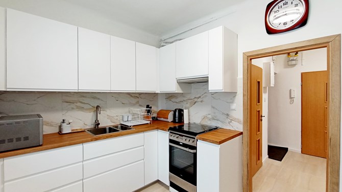 Kuchnia: lodówko-zamrażarka, okap, 4-palnikowa płyta gazowa, piekarnik, mikrofalówka, czajnik elektryczny, zlewozmywak, stół + 4 krzesła.