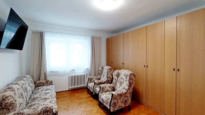 Pokój nr 1: TV, kanapa rozkładana, 2 x fotel, stół + 5 krzeseł, szafa.