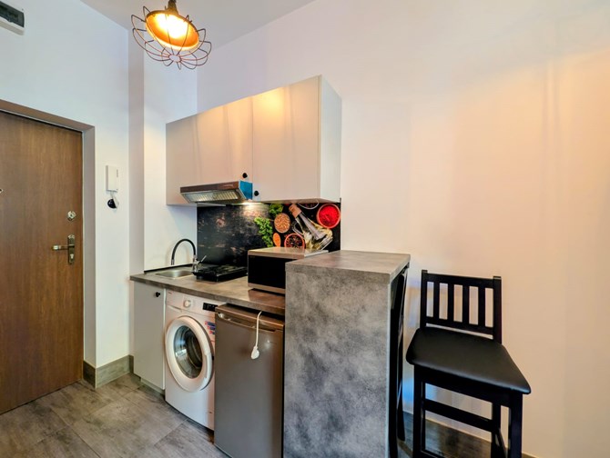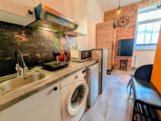 Pokój z aneksem: szafki wiszące i stojące, rozkładana sofa, szafa, wysuwany stół, krzesła, szafka, kuchenka mikrofalowa, dwupalnikowa płyta, lodówka, pralka, umywalka.