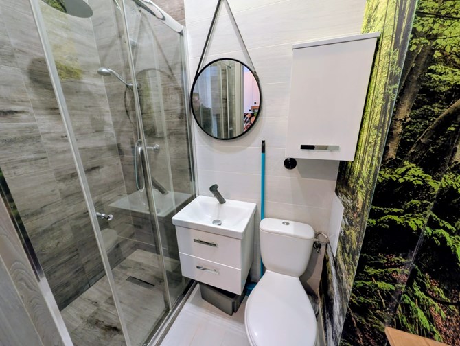 Łazienka z WC: kabina prysznicowa, lustro z umywalką, szafka.