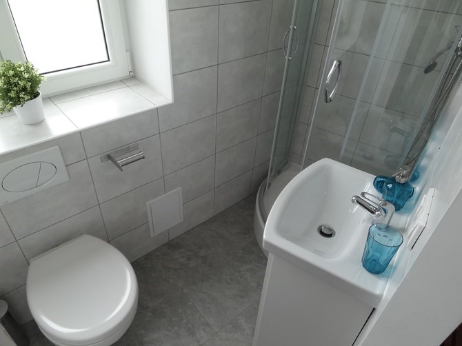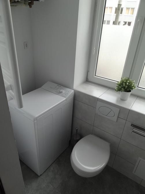 Łazienka: kabina prysznicowa, pralka oraz WC.