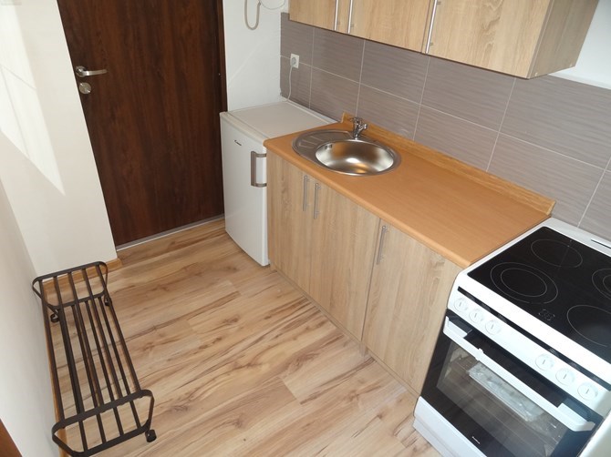 Aneks kuchenny: lodówka, płyta grzewcza i piekarnik.