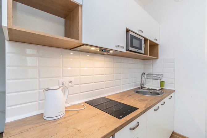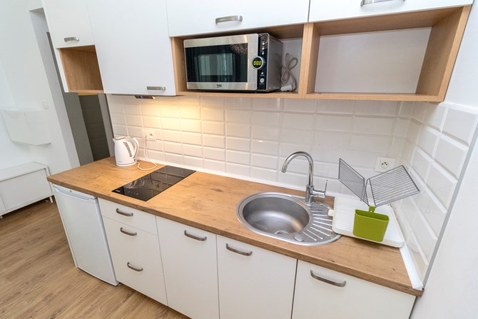 *Kuchnia: szafki, lodówka, kuchenka elektryczna dwupunktowa, czajnik i kuchenka mikrofalowa