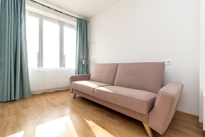 *Pokój: rozkładana sofa, stół, szafa i komoda