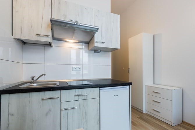Aneks kuchenny: szafki wiszące i stojące, lodówka, dwupalnikowa płyta elektryczna, zlewozmywak, okap.