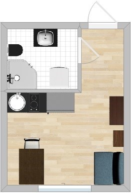 Pokój: rozkładana jednoosobowa sofa, stół z krzesłem, szafa, komoda, półka.
