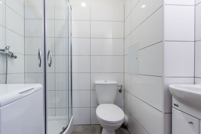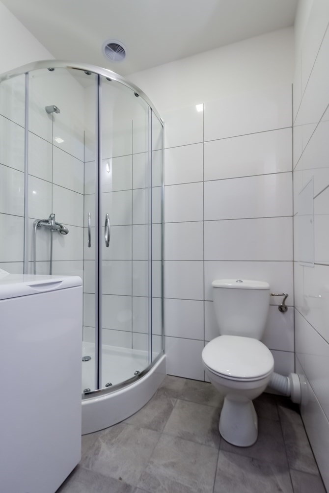 Łazienka: kabina prysznicowa, pralka, umywalka z szafką, lustro z półką, WC, w glazurze i terakocie.