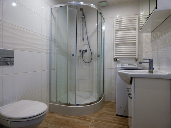 Łazienka z WC: kabina prysznicowa, pralka, umywalka, szafka wisząca.