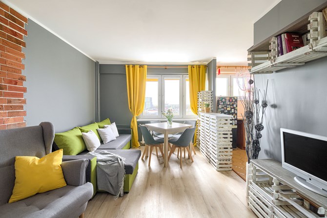 Lokal o powierzchni 45 m2 składa się z salonu z aneksem kuchennym, sypialni, łazienki.