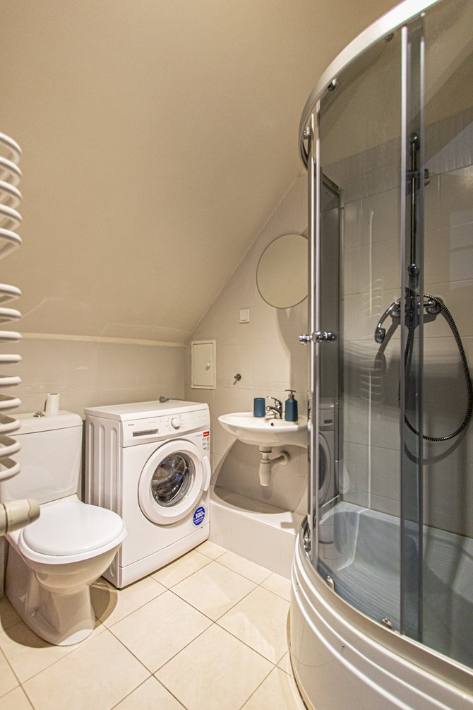 Łazienka: pralka, kabina prysznicowa, umywalka, lustro, WC.