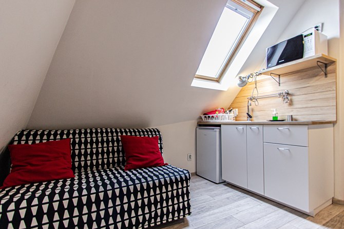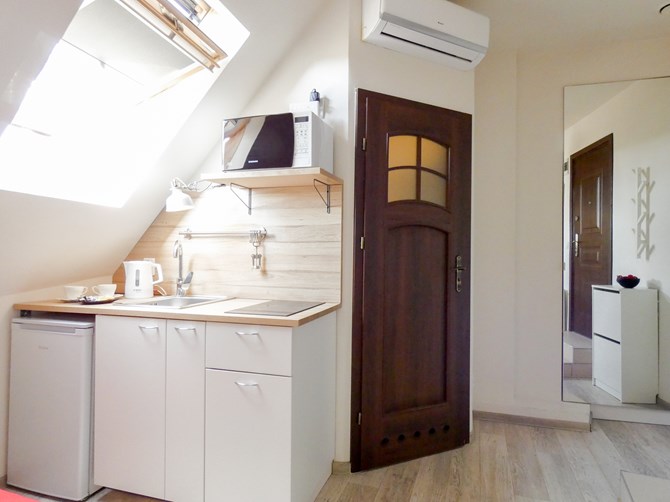 Aneks kuchenny: lodówka, mikrofalówka, czajnik elektryczny, płyta elektryczna, meble stojące, zlew.