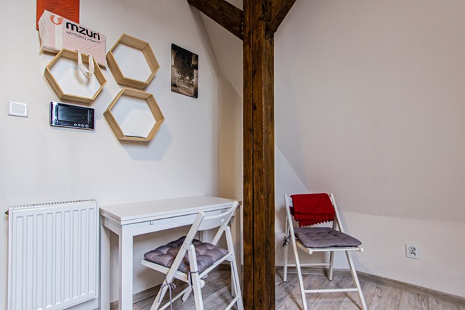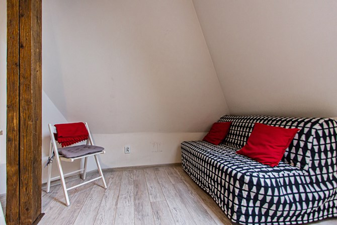 Pokój: rozkładana kanapa, stół z możliwością powiększenia, 2 składane krzesła.