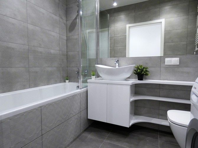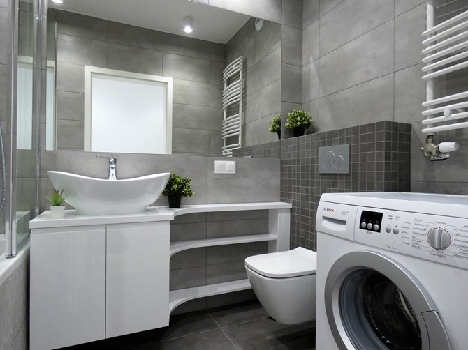 Łazienka: wanna, umywalka, toaleta, pralka, szafka.