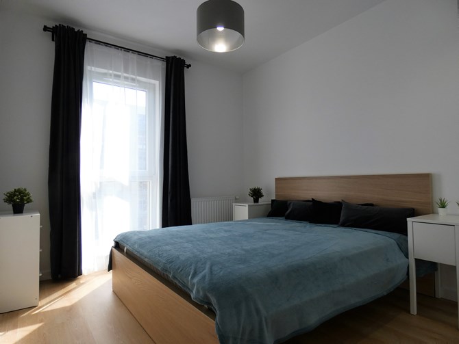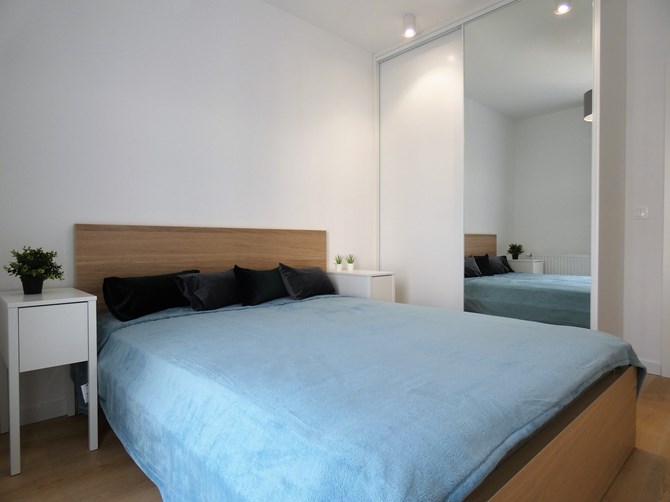 Sypialnia: duże łóżko, dwie szafki nocne, komoda, pojemna szafa.