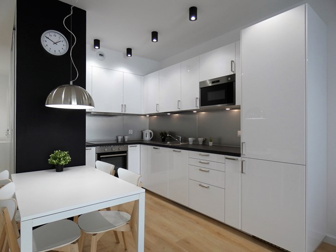 Aneks kuchenny: meble kuchenne, lodówka dwudrzwiowa, mikrofalówka, piekarnik elektryczny, zmywarka, płyta ceramiczna czteropalnikowa, zlewozmywak, czajnik bezprzewodowy, okap, stół z krzesłami.