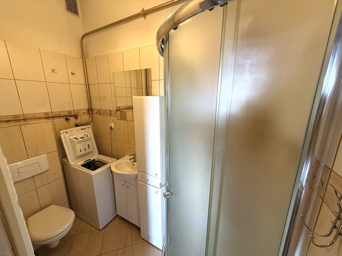 Łazienka wyposażona w pralkę, umywalkę z szafką, natrysk.