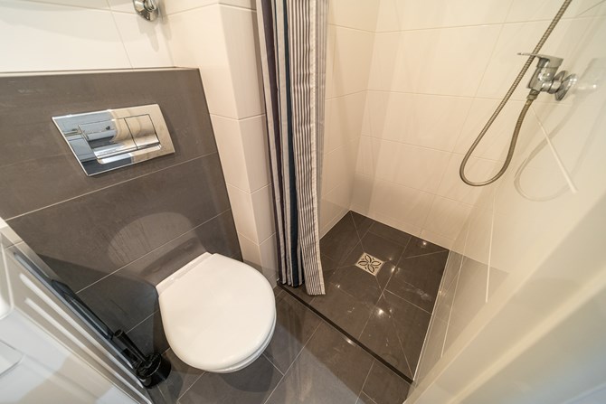 Łazienka: prysznic, szafka, umywalka, WC, pralka.