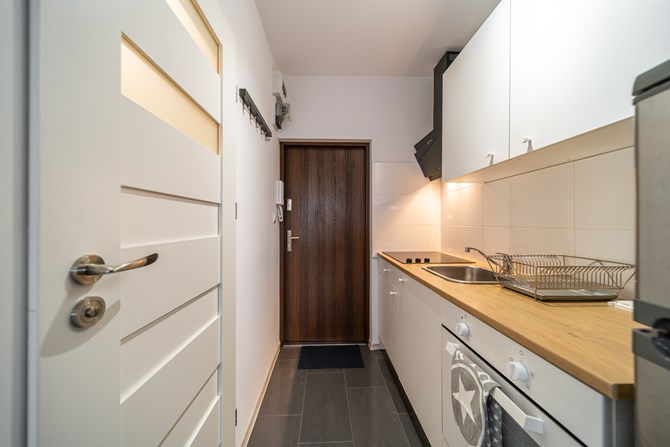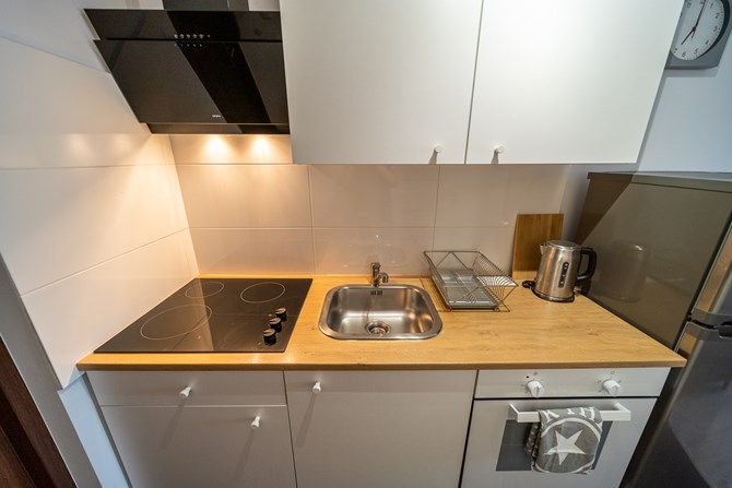 Aneks kuchenny: szafki, zlew, płyta elektryczna 4-palnikowa, piekarnik elektryczny, okap, lodówka.