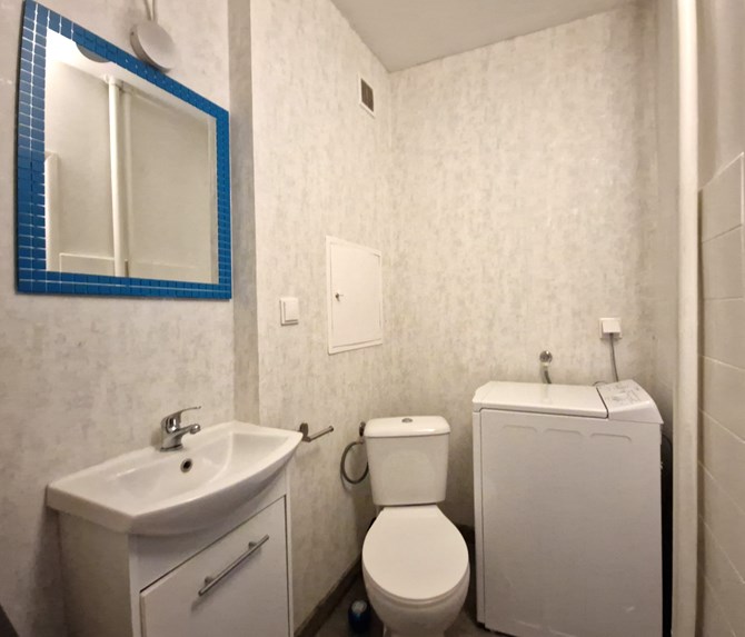 Łazienka z WC: wanna, pralka, umywalka, lustro, szafki.