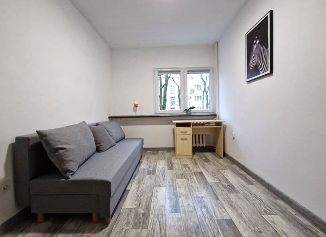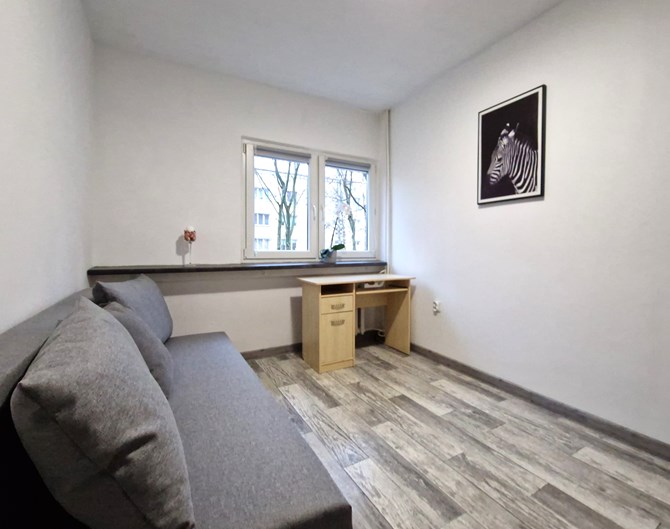 Pokój 2 : rozkładana kanapa, biurko, szafa, szafka.
