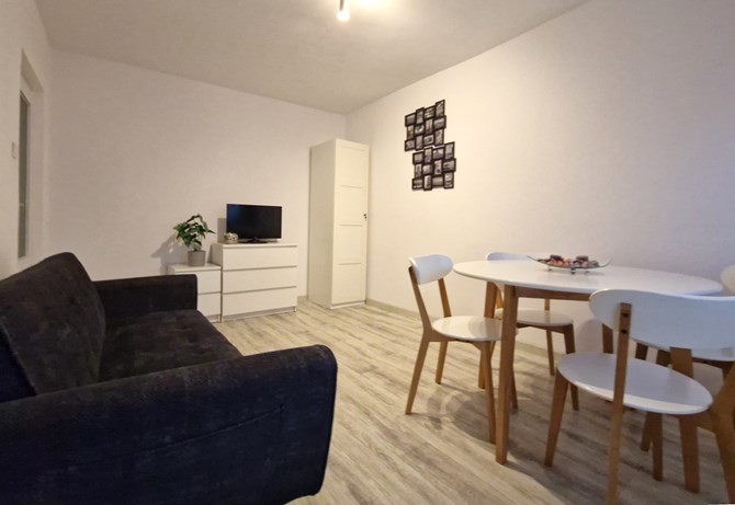Pokój: rozkładana kanapa, stół z 4 krzesłami, komoda, telewizor, szafka szafa.