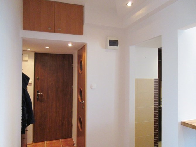 Przedpokój: szafka na buty, wieszak i duża szafa wnękowa z lustrem.