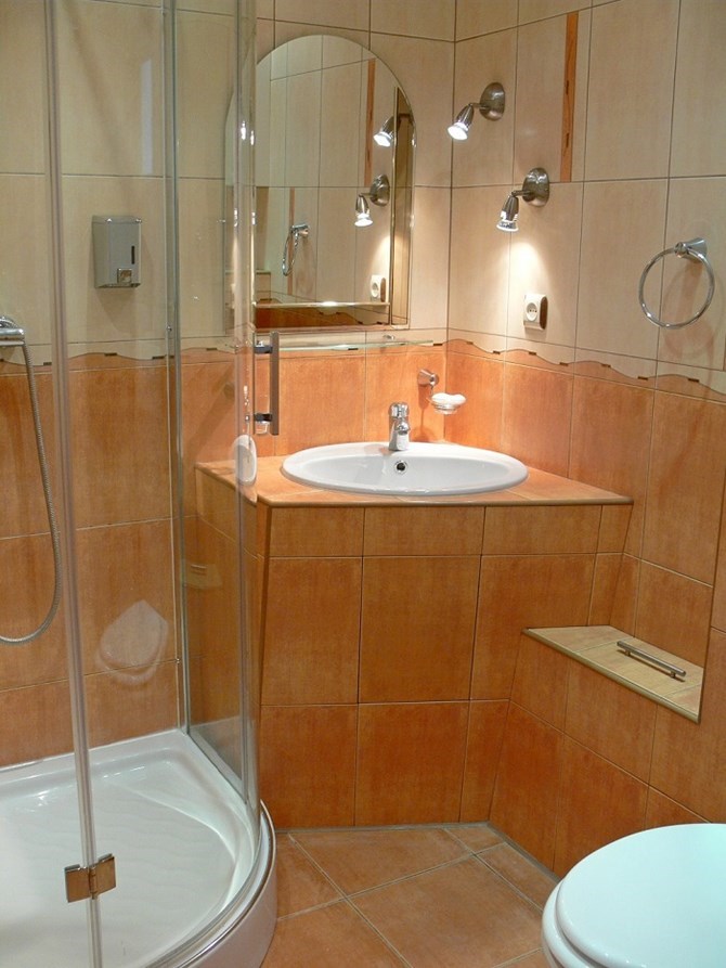 Łazienka: kabina prysznicowa, WC i umywalka.