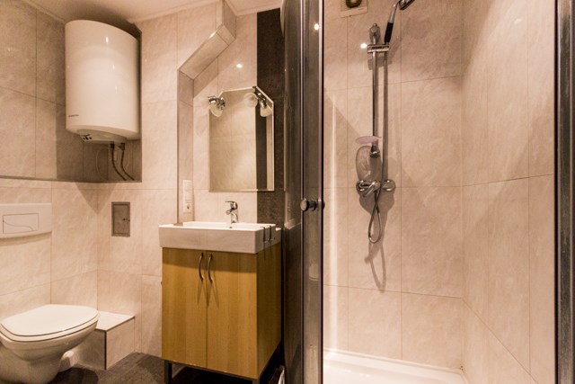 Łazienka: kabiną prysznicowa, pralka, WC i umywalka.