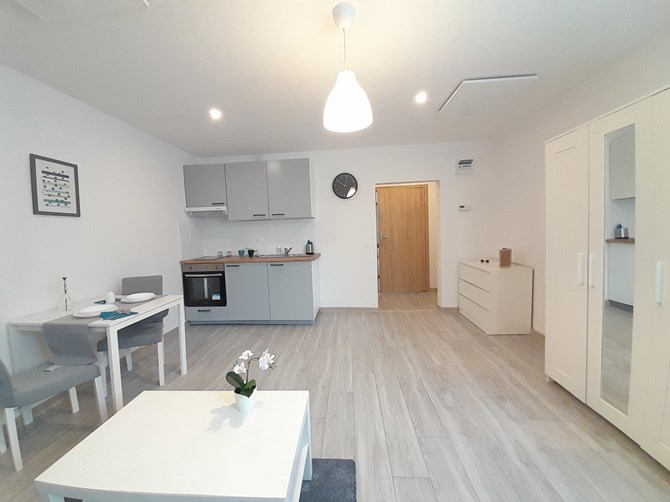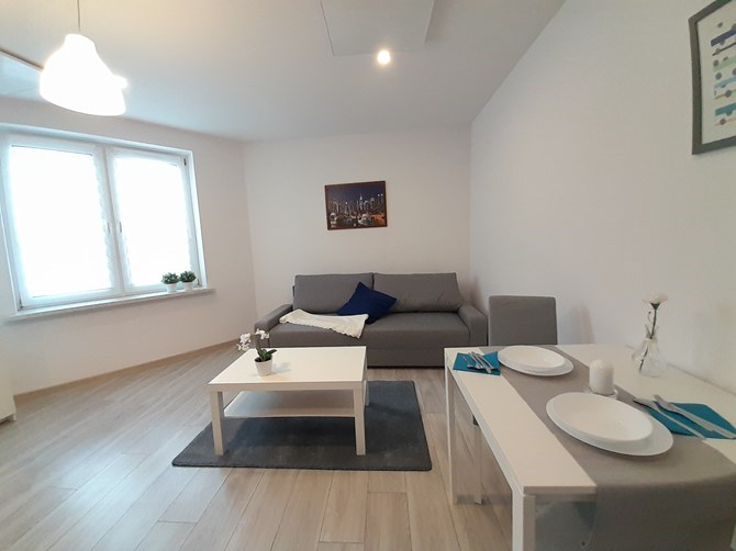 W pokoju znajduje się rozkładana kanapa, stolik kawowy, komoda, szafa oraz stół z dwoma krzesłami.