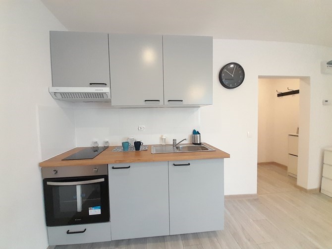 Aneks kuchenny wyposażony jest w szafki, płytę elektryczną, piekarnik oraz lodówkę.