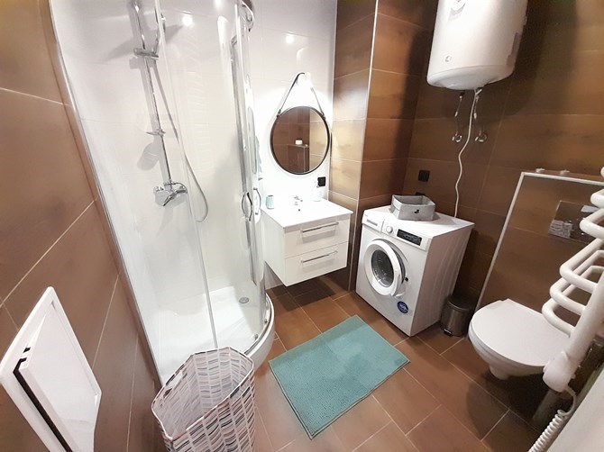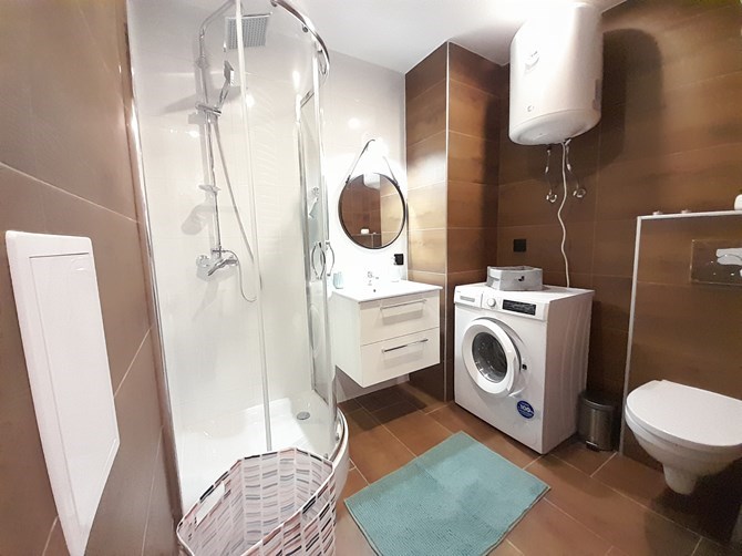 Łazienka z WC posiada pralkę, kabinę prysznicową, umywalkę, szafkę oraz lustro.