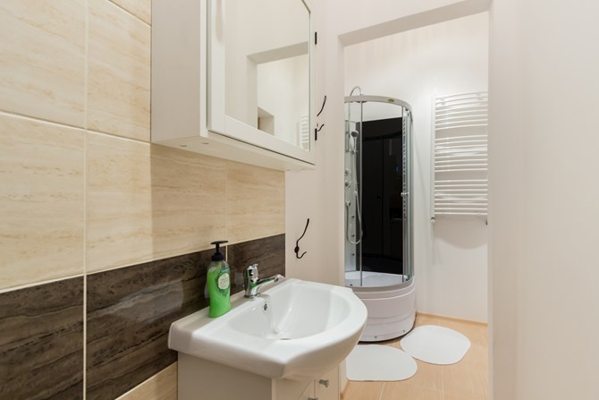 Łazienka: kabina prysznicowa, WC, umywalka, lustro, szafki na kosmetyki.