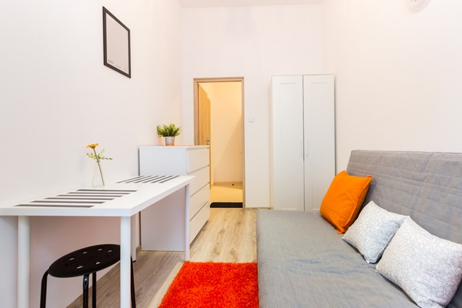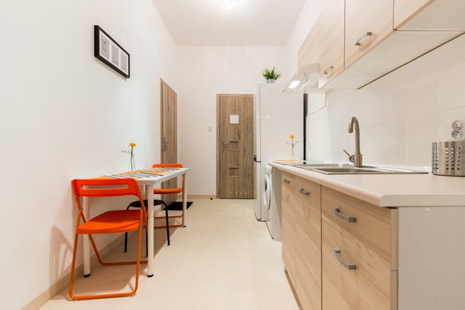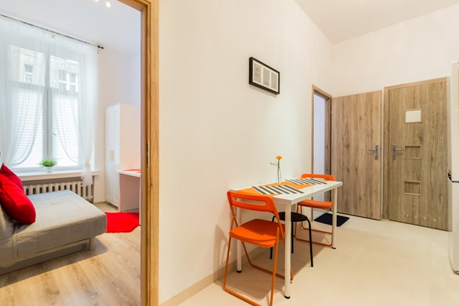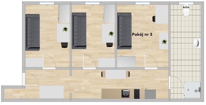 Pokój znajduje się w mieszkaniu złożonym z trzech oddzielnych pokoi, z dostępem do wspólnej łazienki i aneksu kuchennego.