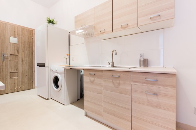 Kuchnia: szafki kuchenne, okap, kuchenka elektryczna, lodówka z zamrażalnikiem, zlew, pralka.