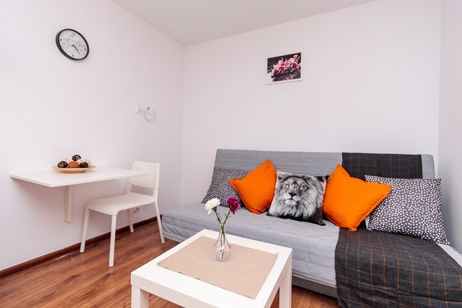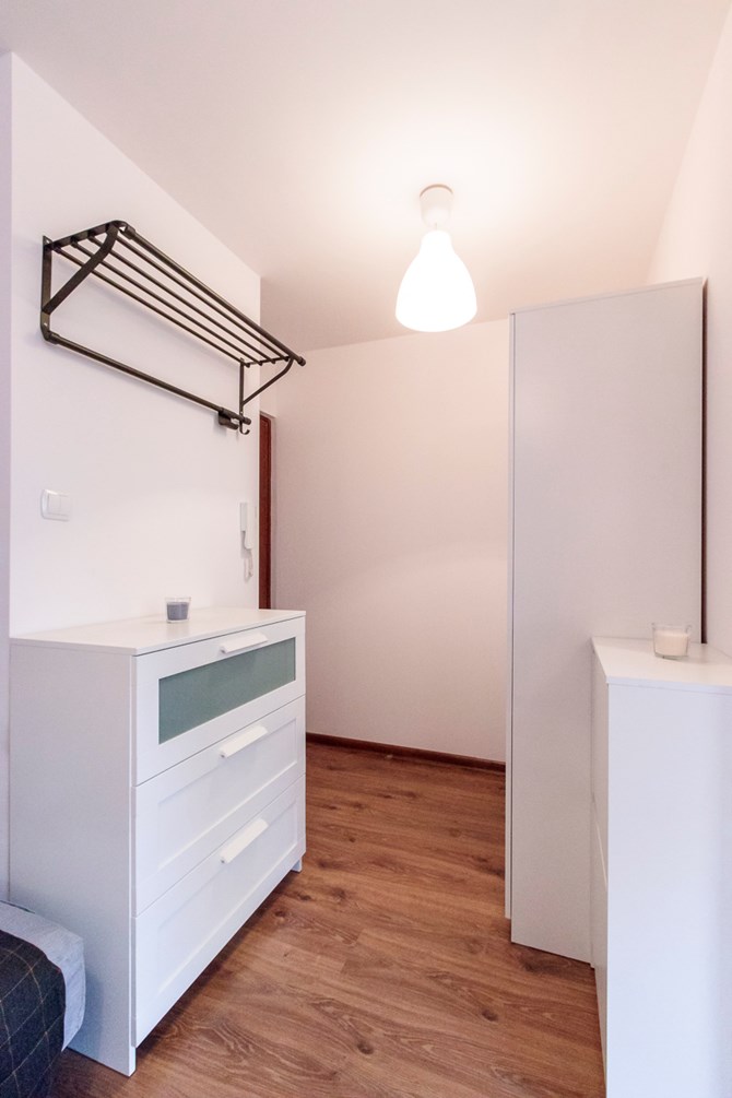 Pokój: kanapa z funkcją spania, stolik kawowy, szafa, komoda, grzejnik-konwektor elektryczny.
