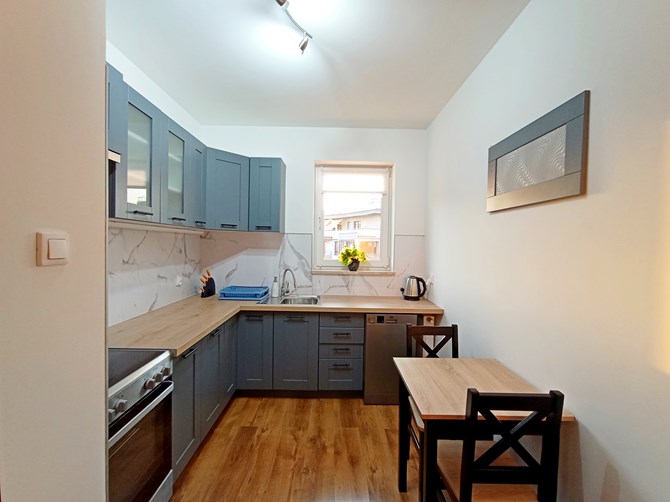 Kuchnia: lodówko-zamrażarka, okap, 4-palnikowa płyta elektryczna, piekarnik, zmywarka, czajnik elektryczny, zlewozmywak, stół + 2 krzesła.