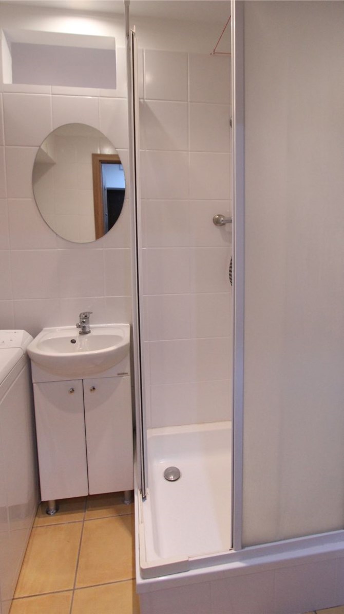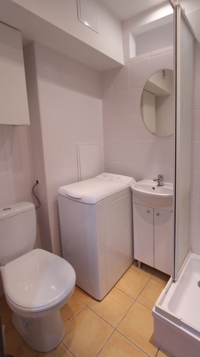 Łazienka: kabina prysznicowa, pralka, WC, umywalka.
