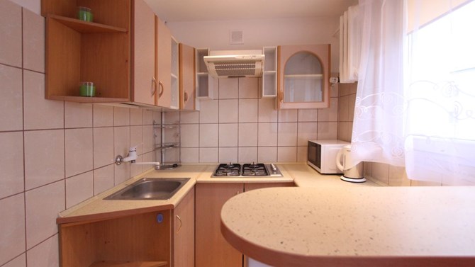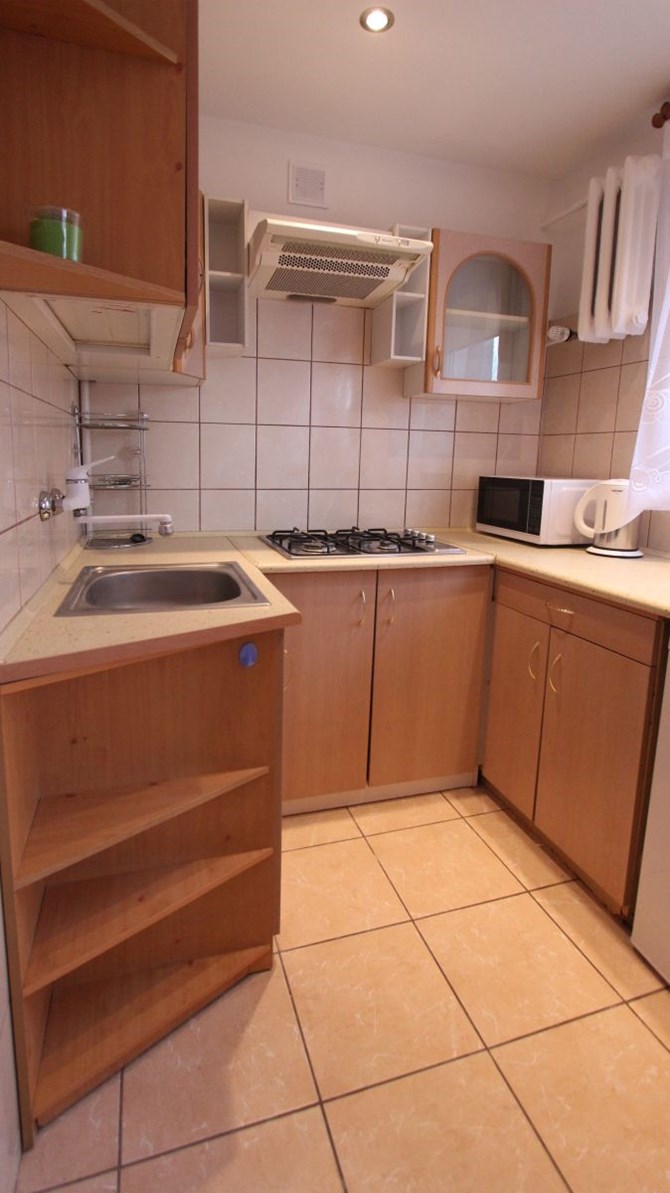 Kuchnia: funkcjonalna zabudowa, lodówka, kuchenka gazowa, kuchenka mikrofalowa.