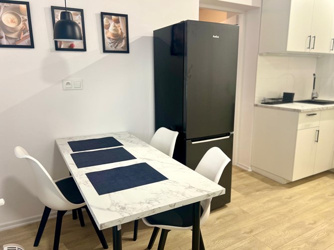 Aneks kuchenny: meble, piekarnik, lodówka, stół, krzesła, płyta elektryczna,